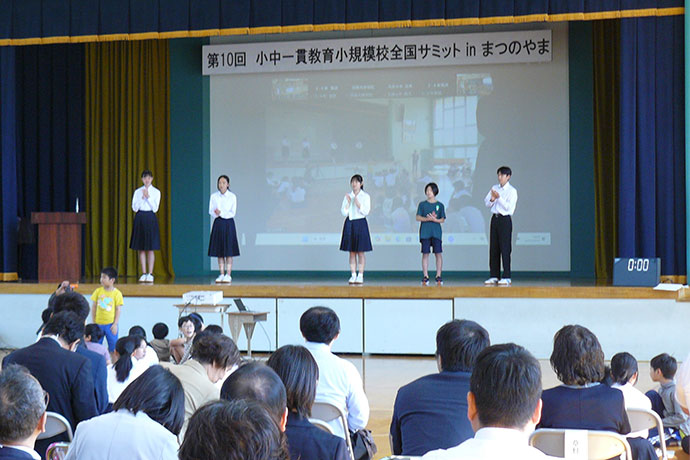 2025年10月10日まつのやま学園で行われた「第10回小中一貫教育小規模校全国サミットinまつのやま」。学園の児童や生徒たちの活動をゲームや発表などを通じて発信した