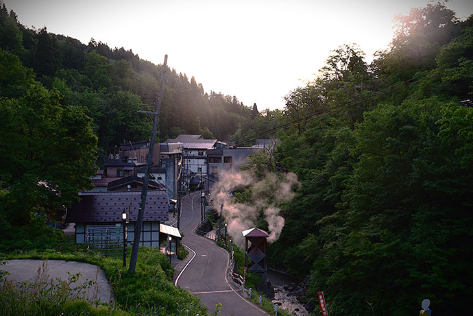 ブラックシンボルのある辺りから松之山温泉街を見下ろす。まさにこの地に逗留した作家坂口安吾のいう「山のどん底」にあるような景色が広がっている