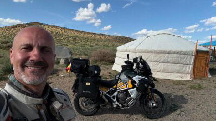ユーラシア大陸横断の旅の途中では、洪水に合ったり地元の人たちとの交流があったり、地域の文化と暮らし、自然に向き合う旅が続いた。アラモ氏の愛車はトライアンフのTiger 1200cc Rallyexplorer