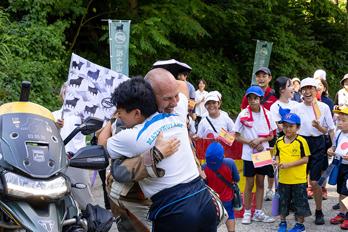 7月22日午後2時30、オートバイに乗ったアダモ氏が温泉街の道を登ってくる。子どもたちや温泉街の旅館関係者など約100名が沿道を埋め、それぞれ国旗を振って盛大に出迎えた。オートバイから降りたアラモ氏に、突然まつのやま学園の子どもの一人が走り寄り歓迎と祝福のハグ。予定にはない突然の出来事にアラモ氏だけでなく周囲も驚き、ひときわ盛り上がった。