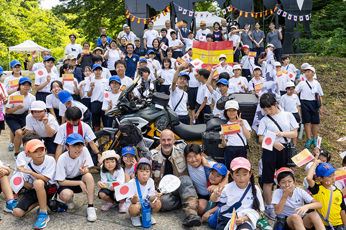2025年7月22日14時30分、スペインバルセロナを出発したフリオ・アラモ氏がオートバイで大陸を横断、イタリア、トルコ、アルメニア、トルキスタン、モンゴル、ロシアなど11か国を経て、ウラジオストクからフェリーで韓国、そして境港まで。約2万2000㎞を走破し、最後のブラックシンボルがある松之山温泉街でのゴールを達成した